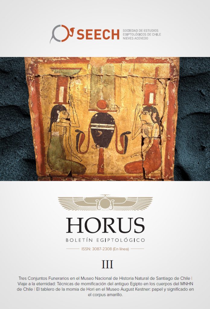 El primer artículo de esta edición corresponde a un detallado estudio, análisis y transliteración de cada uno de los sarcófagos pertenecientes a la colección egipcia del MNHN de Santiago realizado por el Dr. Jonathan Elias, quien nos invita no solo a tener un acercamiento con la identificación genealógica de los nombres de cada individuo, sino que además aporta a una descripción estética y simbólica. El segundo artículo de Verónica Silva-Pinto, comprende el primer análisis bioantropológico de los tres cuerpos momificados de la colección egipcia. Un completo estudio que nos habla y reflexiona acerca de los procesos de momificación del antiguo Egipto, entregando resultados inéditos acerca de este proyecto y sus próximos desafíos. Concluimos con el artículo El tablero de la momia de Hori en el Museo August Kestner. Papel y significado en el corpus amarillo, presentado por los egiptólogos Rogério Souza y Christian Loeben, quienes nos presentan una completa descripción y análisis acerca esta pieza, destacada por su manufactura y significado.